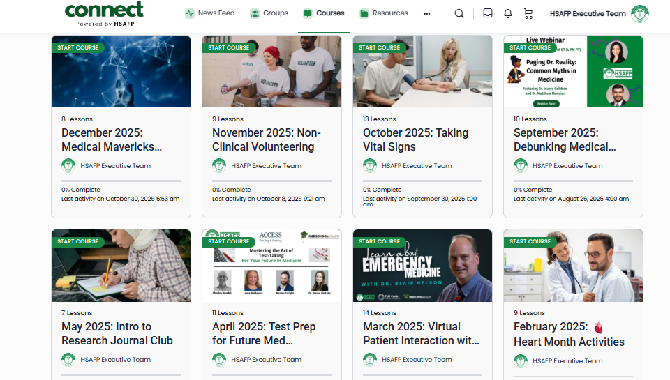Unique to any other high school student group organization, HSAFP incorporates these pre-med competencies in virtual and hands-on curriculum—updated monthly—to ensure all high school students can build crucial skills needed as a pre-med student, medical student, resident, and, eventually, physician.
